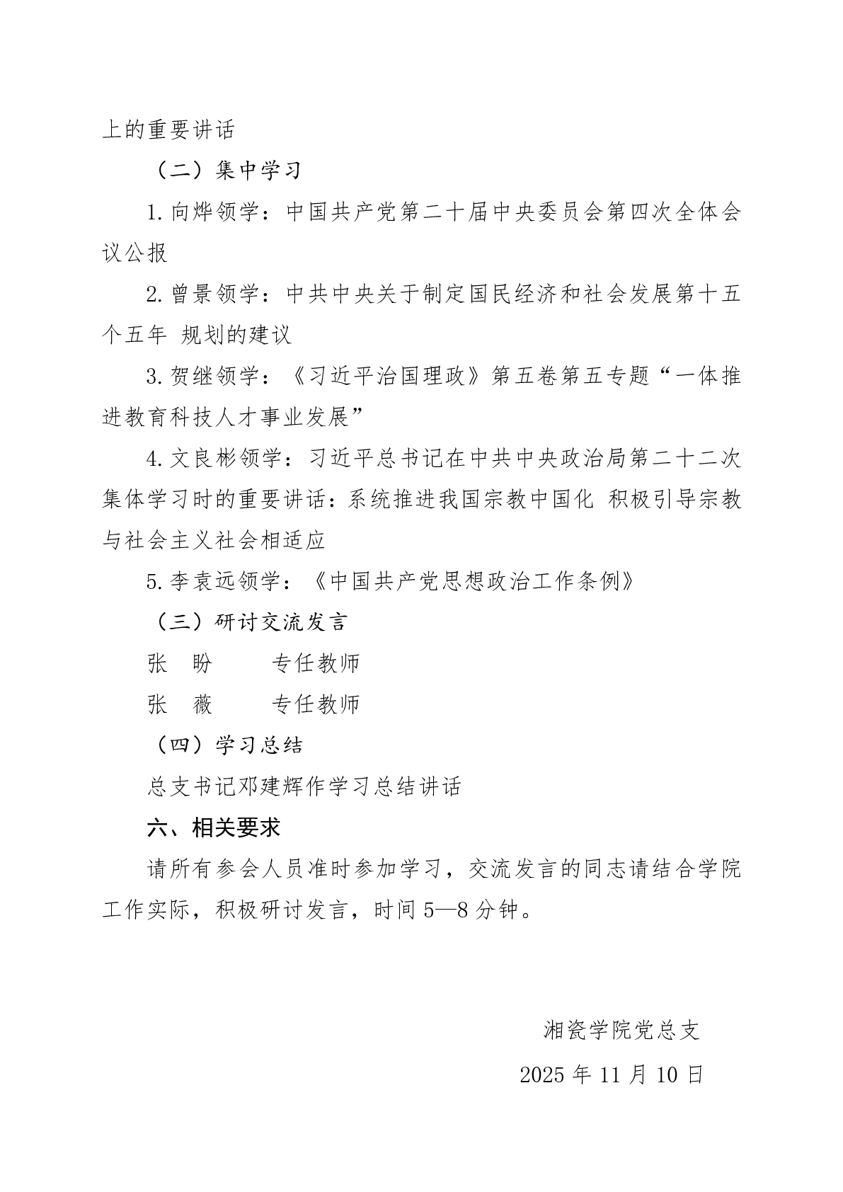 湘瓷学院党总支理论学习中心组 2025年第十次集中(扩大)学习安排